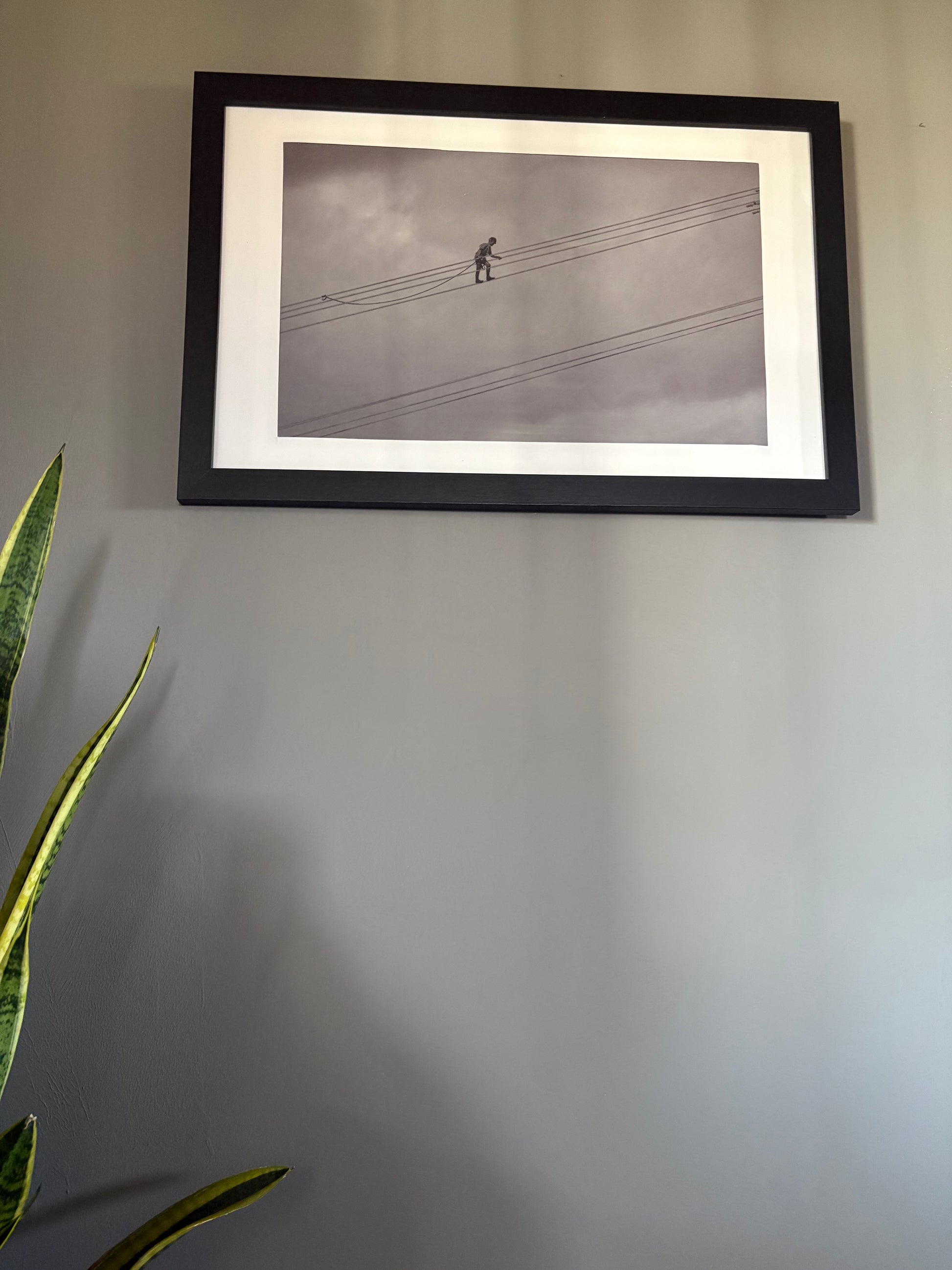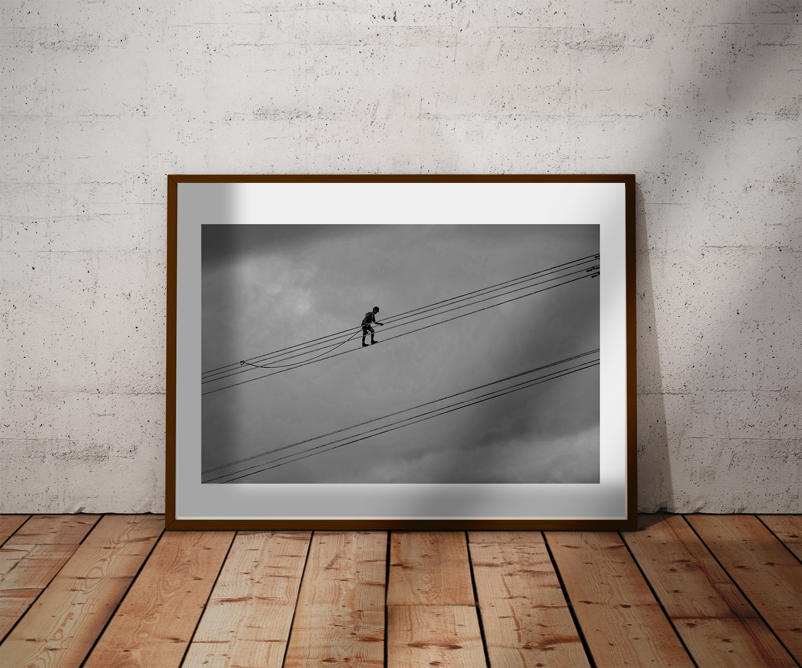 Every detail speaks: the tension in the harness, the silhouette of outstretched arms braving the wind, the stark geometry of transmission lines slicing through the sky. It’s a portrait of focus, risk, and responsibility — the human form dwarfed by infrastructure yet never overpowered by it.