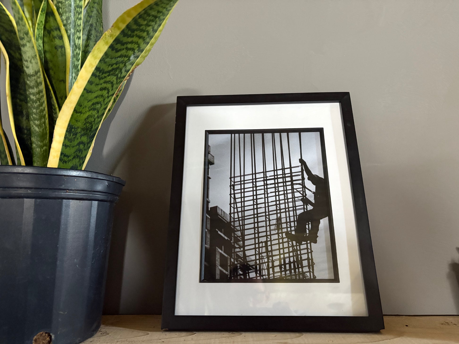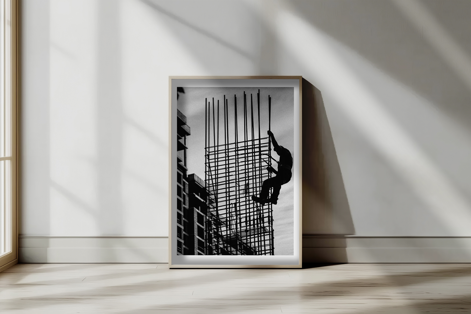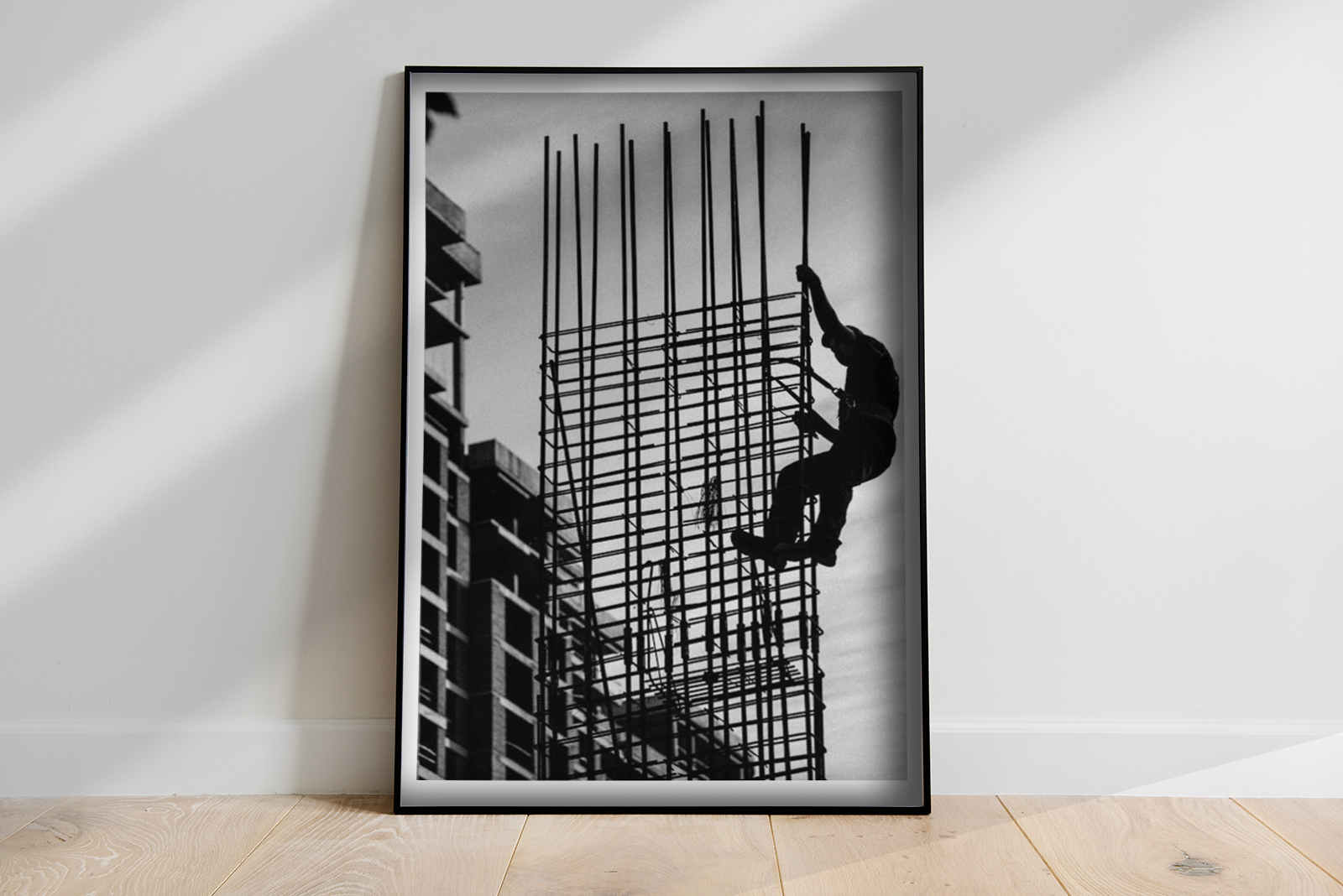 “Skywalker” captures the fearless ascent of an ironworker climbing skeletal steel high above the ground — a solitary figure framed against the vast emptiness of sky and skyline. In stark black and white, the grain of the photo evokes a timeless, almost mythic quality — a nod to generations of men and women who’ve shaped cities with their hands and risked everything for the view from above. It’s not just about the height — it’s about honor in the climb, trust in the structure, and pride in the weld.