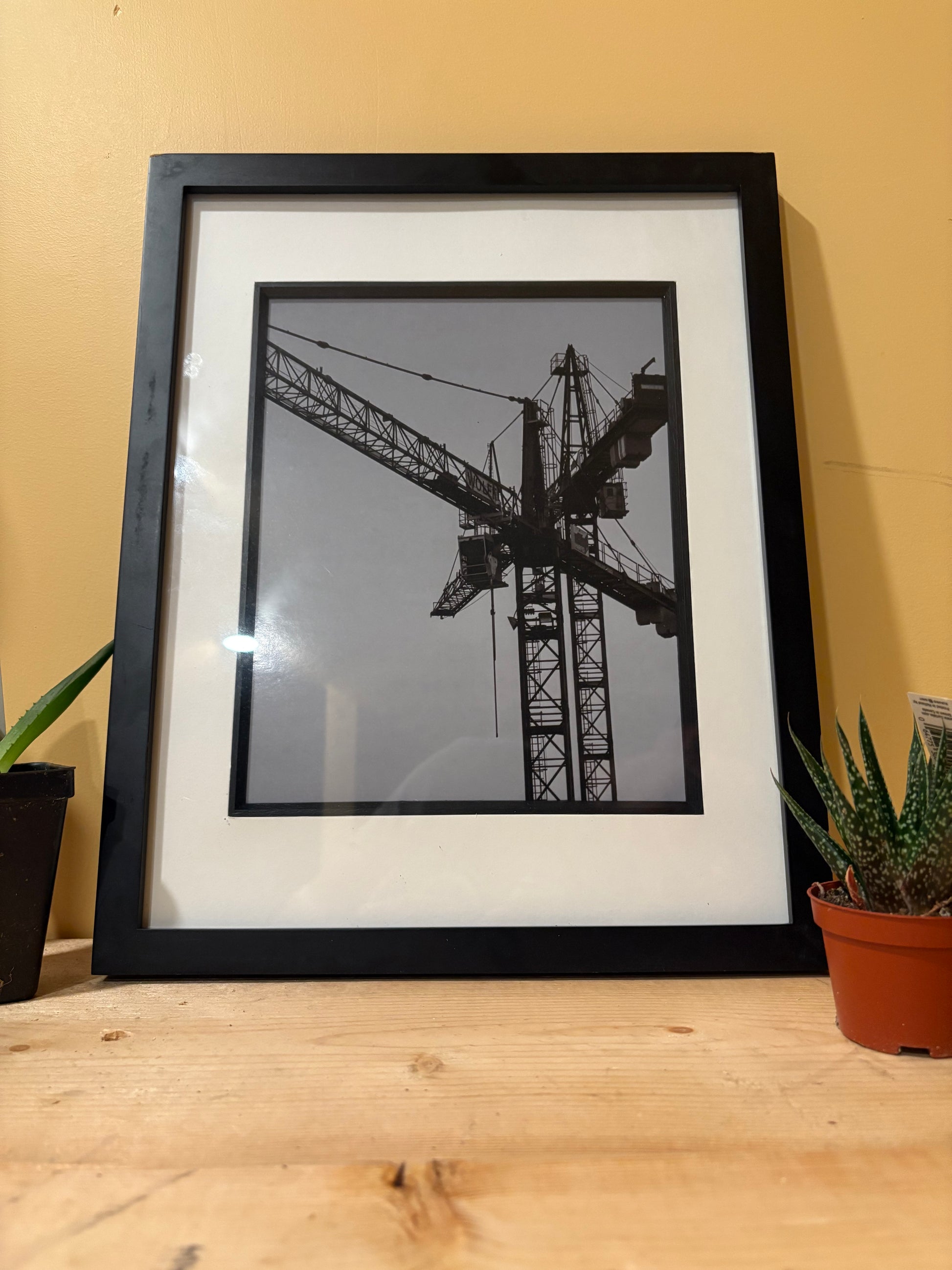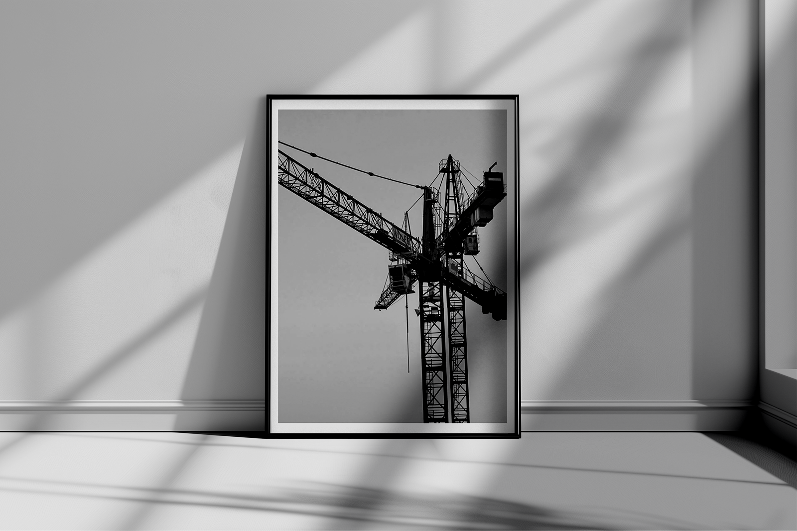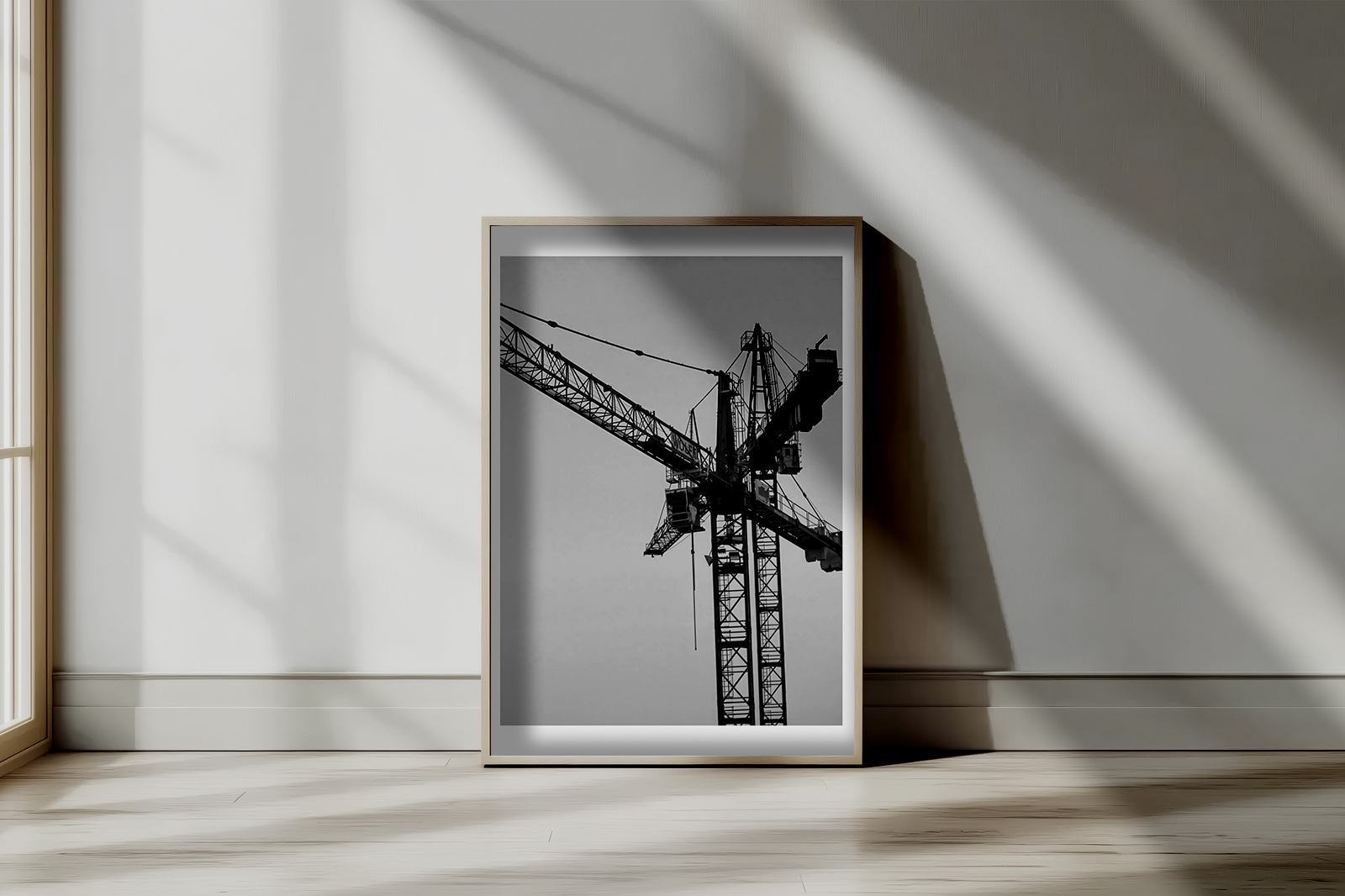 Shot from below, the perspective honors the scale and poetry of construction — the quiet power of machinery that lifts steel beams and cities alike. In monochrome, the image becomes timeless, emphasizing contrast, detail, and the story of human will behind every skyline.