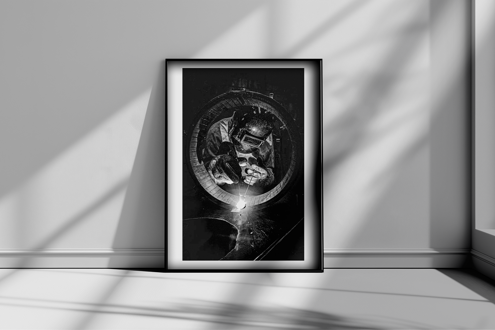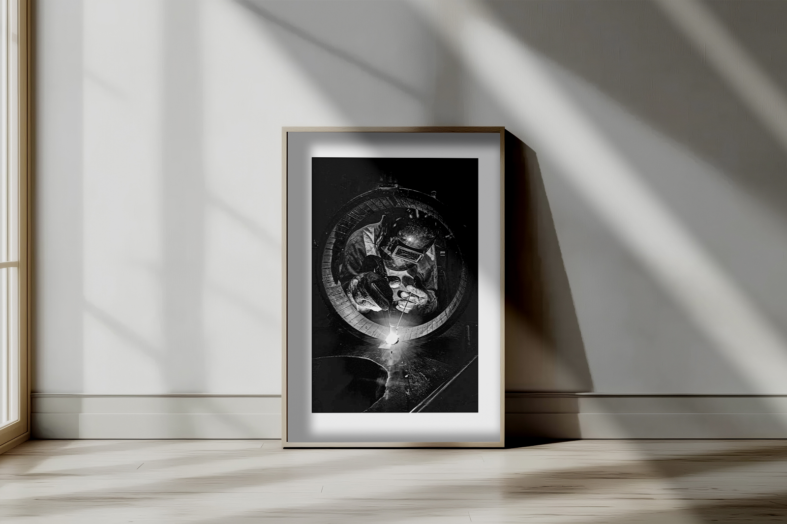 “Core Heat” is a striking black and white photograph capturing a welder deep within the hollow heart of a massive pipe — a silhouette against a flash of fire and smoke, where light curves and shadows dance. Inside this confined steel world, the tradesman becomes both sculptor and soldier, fusing metal with pure precision under pressure.